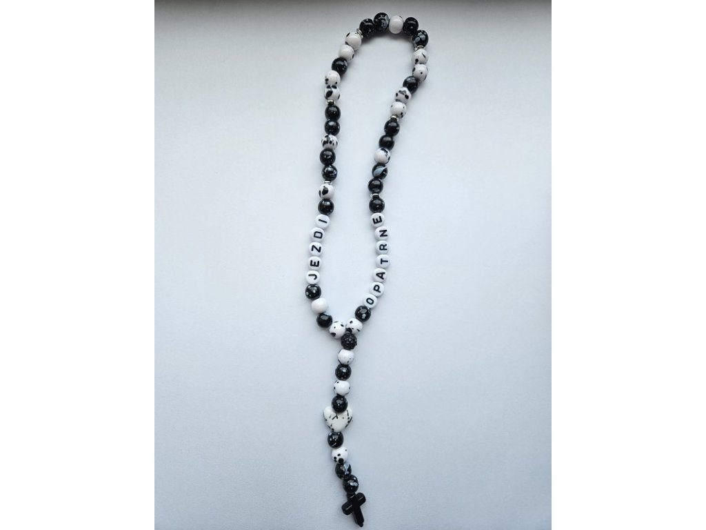 Černý růženec obsahuje černé a bílé skvrnité korálky 8 mm, srdce 1,4 cm, křížek černý 1,5 cm, prostřední korálek s kamínky 8 mm, písmena 7 mm, oddělovače 6 mm.
